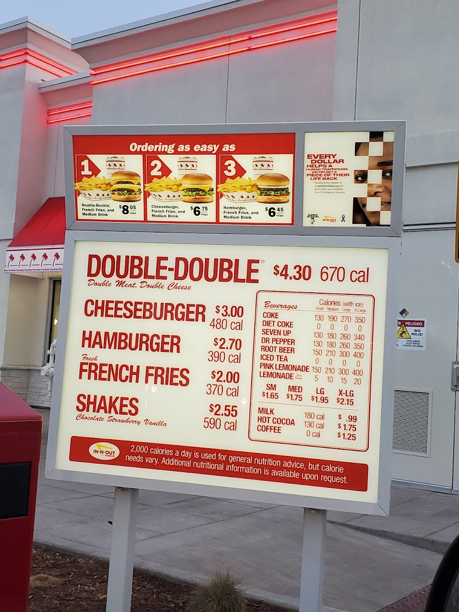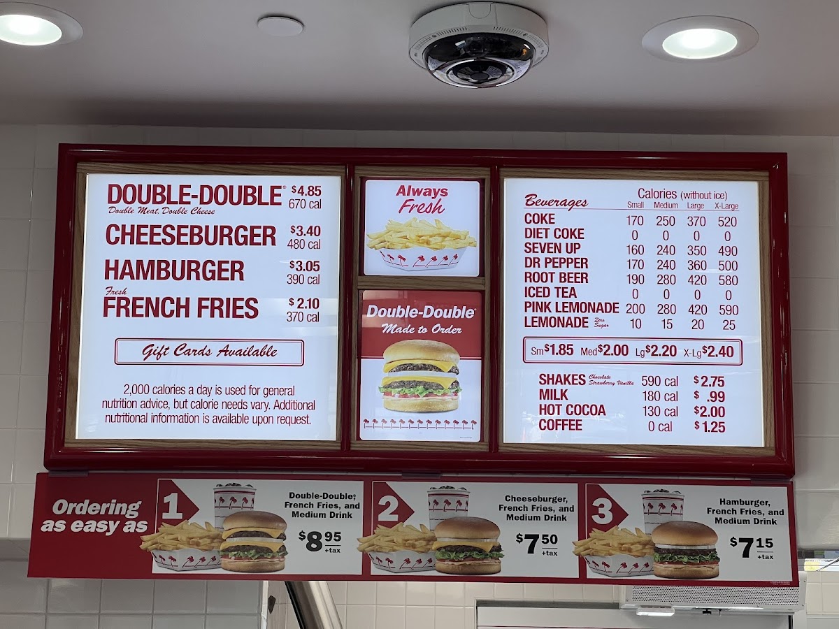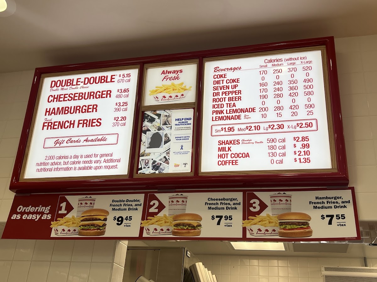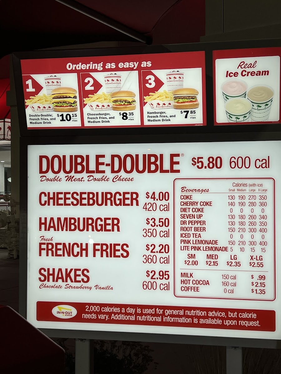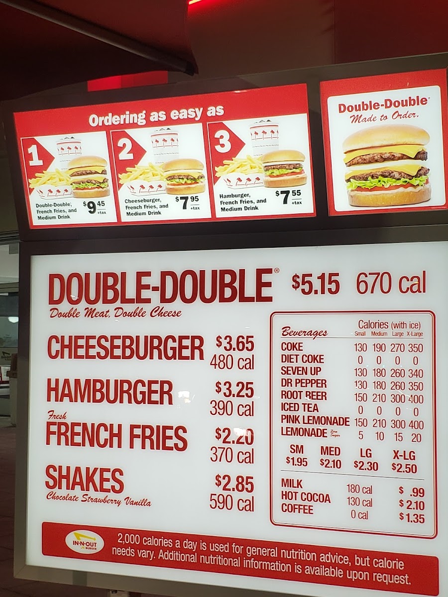In-N-Out Burger stands out with its straightforward yet iconic menu, specializing in fresh, high-quality burgers and fries. Classics like the Double-Double—two freshly grilled beef patties layered with melted cheese, crisp lettuce, ripe tomatoes, and their signature spread—are stars of the menu. The "Animal Style" options elevate your meal, adding grilled onions, mustard-cooked patties, and extra sauce for bold flavors that fans rave about. Beyond the well-known offerings, In-N-Out’s secret menu invites adventurous diners to customize, with items like the towering "4x4" (four patties, four cheese) satisfying hearty appetites. Fries come hand-cut and seasoned just right, either classic or “Animal Style” with melted cheese and grilled onions. The menu’s simplicity highlights freshness and quality, creating a premium fast-food experience. Quick service and friendly staff complement the tasty, straightforward menu, making each visit fulfilling whether it’s a cheeseburger or a fully loaded “Animal Style” creation.