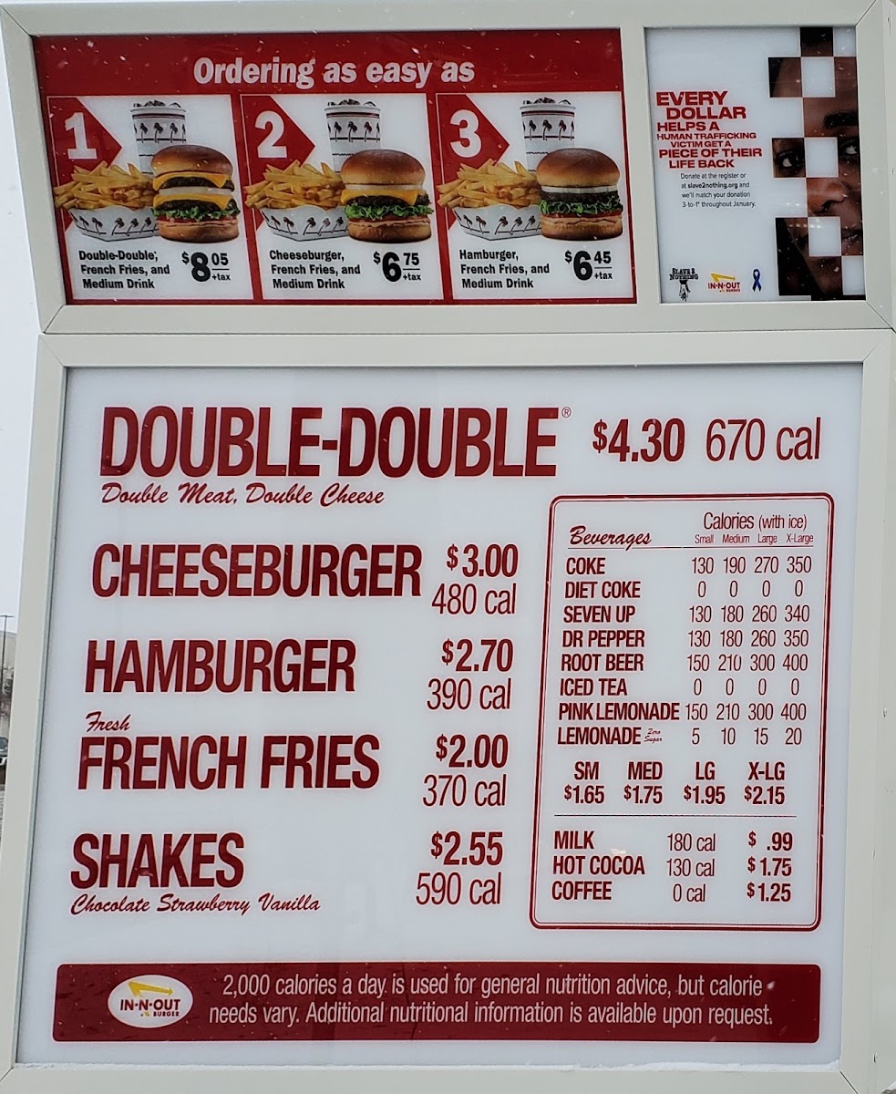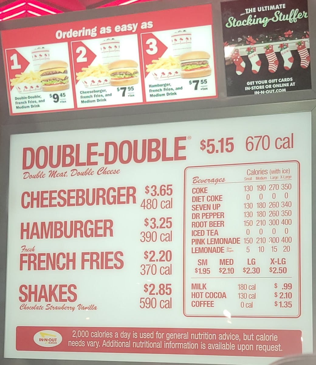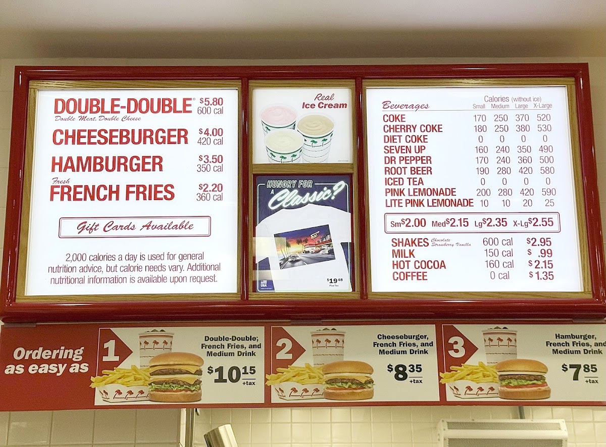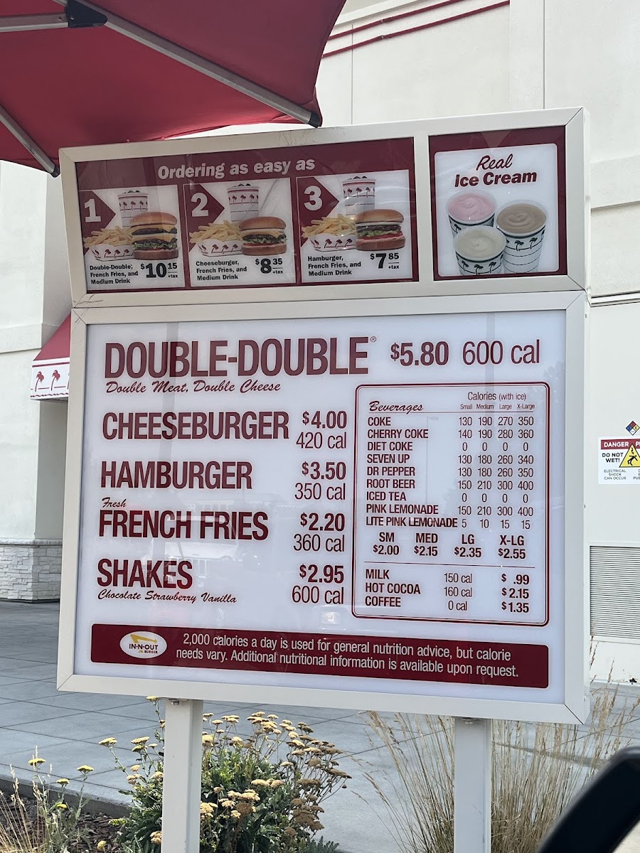 In-N-Out Burger stands out with its straightforward yet iconic menu, specializing in fresh, high-quality burgers and fries. Classics like the Double-Double—two freshly grilled beef patties layered with melted cheese, crisp lettuce, ripe tomatoes, and their signature spread—are stars of the menu. The "Animal Style" options elevate your meal, adding grilled onions, mustard-cooked patties, and extra sauce for bold flavors that fans rave about. Beyond the well-known offerings, In-N-Out’s secret menu invites adventurous diners to customize, with items like the towering "4x4" (four patties, four cheese) satisfying hearty appetites. Fries come hand-cut and seasoned just right, either classic or “Animal Style” with melted cheese and grilled onions. The menu’s simplicity highlights freshness and quality, creating a premium fast-food experience. Quick service and friendly staff complement the tasty, straightforward menu, making each visit fulfilling whether it’s a cheeseburger or a fully loaded “Animal Style” creation.
